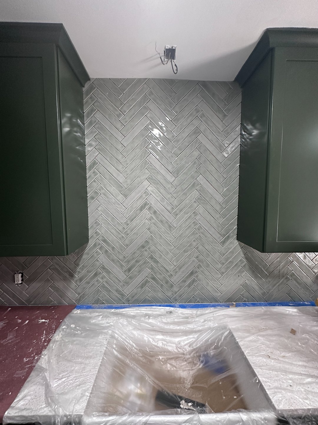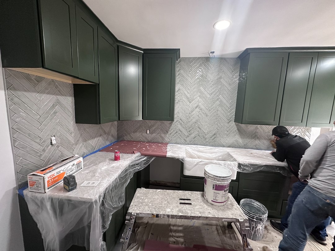 With the space cleared, the team prepared surfaces for new installations and made any necessary repairs to ensure a level, stable foundation for the next steps. We installed new shaker-style cabinets that rise 42 inches tall in a deep green shade to add depth and character while maintaining a classic silhouette. The taller cabinets provide extra storage and a more built-in appearance, which improves both function and visual balance in the room.