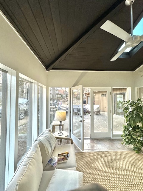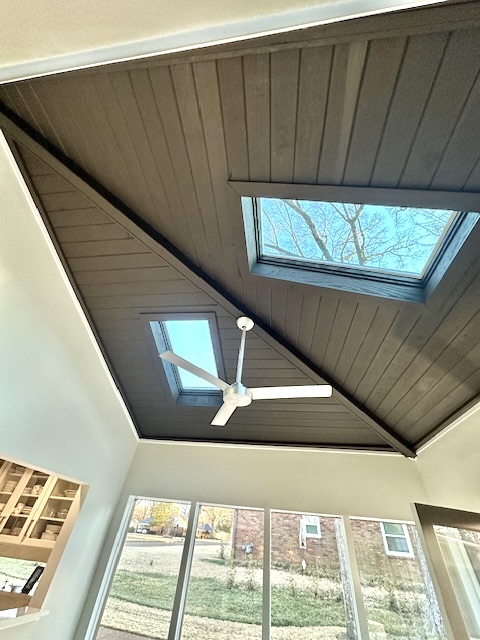 For the vaulted ceiling, we installed tongue and groove boards and created a vaulted shape in the sunroom. We installed the new skylight windows directly into that ceiling so they sit flush and look intentional. After installation, all ceiling surfaces were stained to match, giving the sunroom and greenroom a uniform, finished appearance.