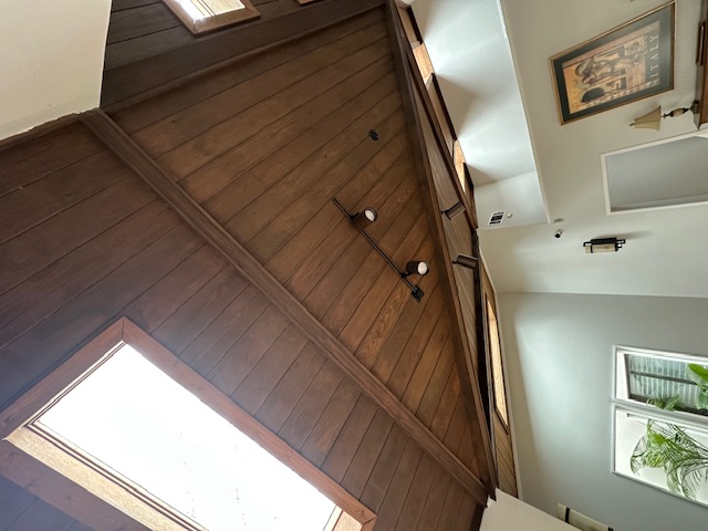After the ceiling and roofing work was complete, we stained all ceiling surfaces so the tongue and groove vaulted ceiling and adjacent areas matched in color and sheen. Staining tied together the new wood surfaces and helped deliver the warm, finished look the rooms needed.