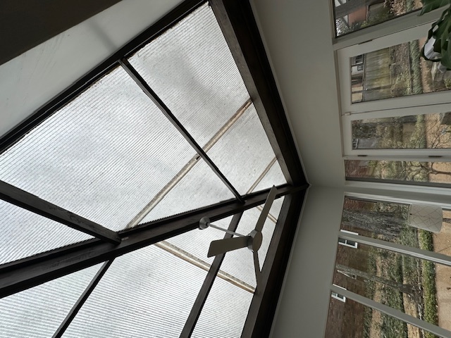 In the greenroom ceiling we replaced the old polycarbonate multiwall panels with new polycarbonate multiwall panels. These panels were fitted and sealed to work with the new framing and to accept the roofing work we completed around them. The panels provide the translucent coverage expected in a greenroom while integrating neatly with the surrounding materials.