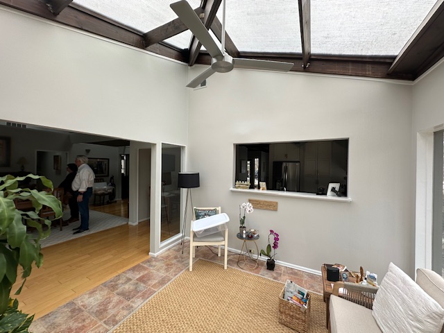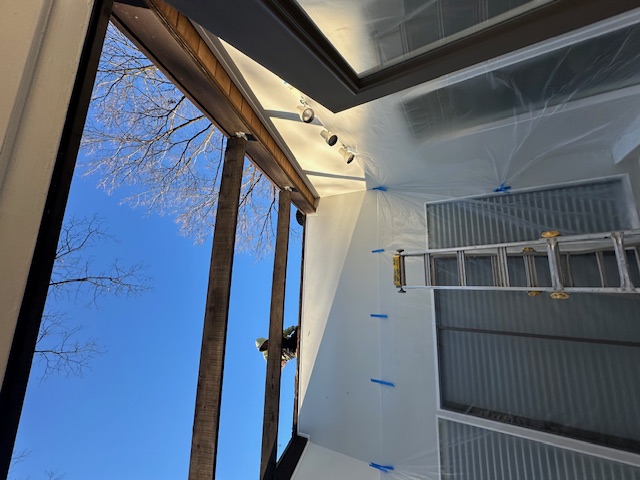 The final interior step was painting all walls and trim inside both the sunroom and the greenroom. Fresh paint completed the renovation by brightening spaces and ensuring trim matched the newly stained ceilings. The combined work gave both rooms a refreshed, coordinated interior and updated roof detailing.
