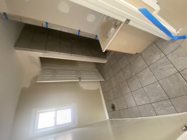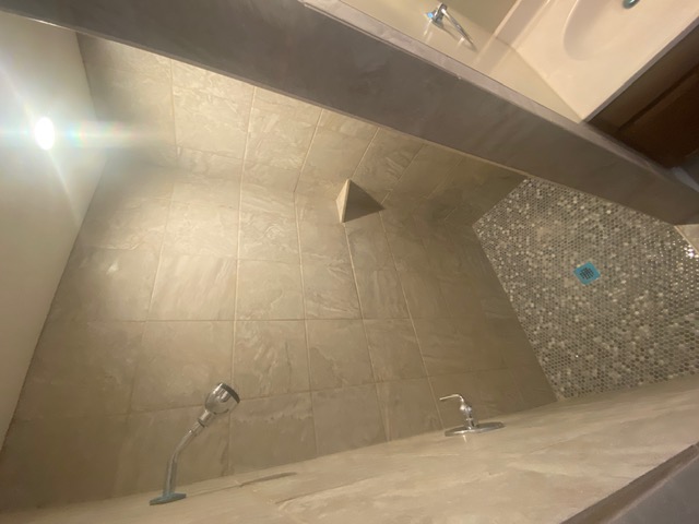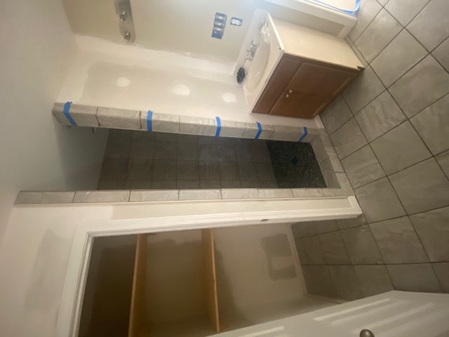 We installed a new vanity complete with updated mirror and lighting, added a custom linen closet door with shelving for improved storage, and completed full tile installation throughout the bathroom. The walk-in shower features clean, modern tile finishes, a built-in tile shelf for toiletries, and durable small-format tile flooring for both style and functionality.