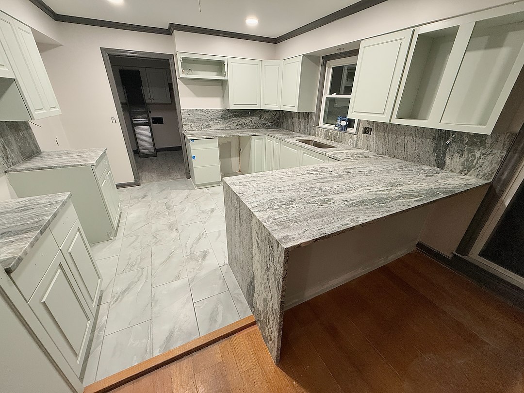 We replaced the subfloor to ensure a stable base, then installed large format ceramic tile flooring for a clean, durable surface that works well in a busy kitchen. With the floor and footprint set, we proceeded with upgraded plumbing and electrical work to support the new layout and appliances.