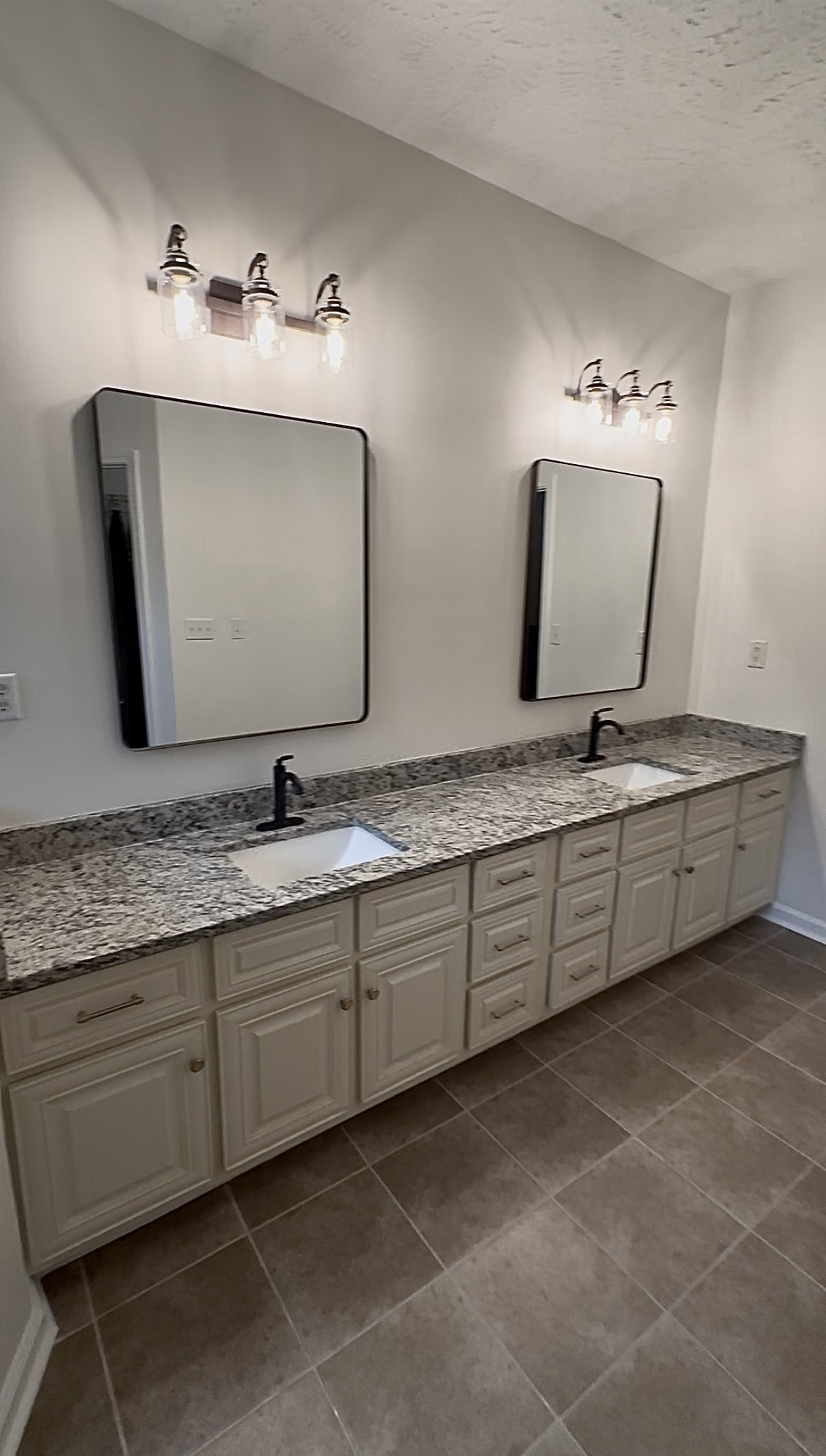 New granite tops and backsplash were measured and installed on the double vanity. The granite was cut to fit the basins and backsplashes precisely, then sealed for durability. New mirrors and light fixtures were mounted above the vanity to complete the updated sink area.